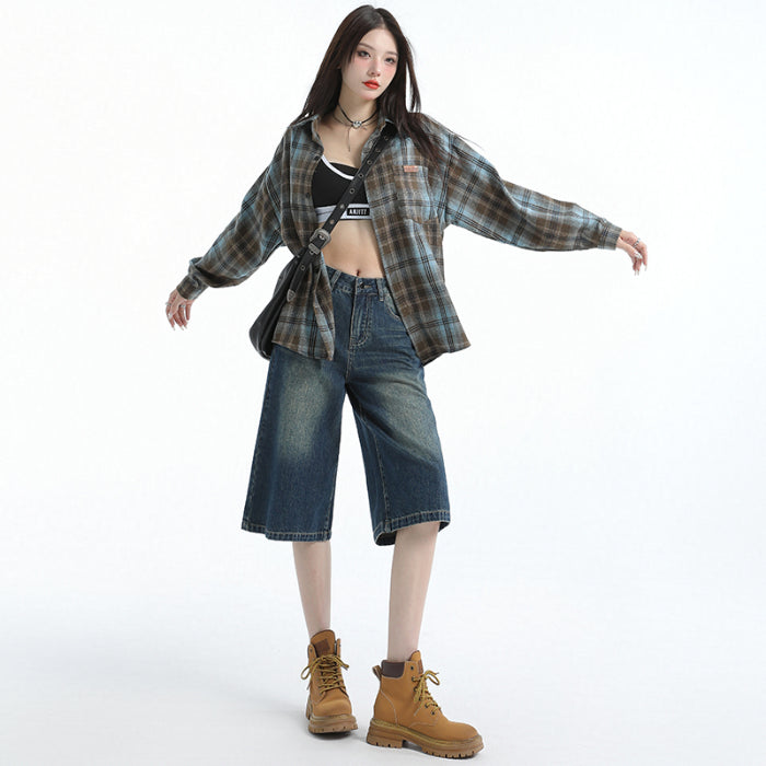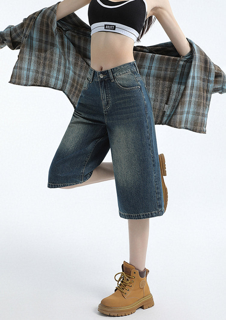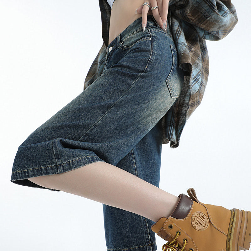 Benimeria-Vintage Hong Kong-style black denim cropped pants - relaxed straight-leg midi length, spring/summer women's fashion